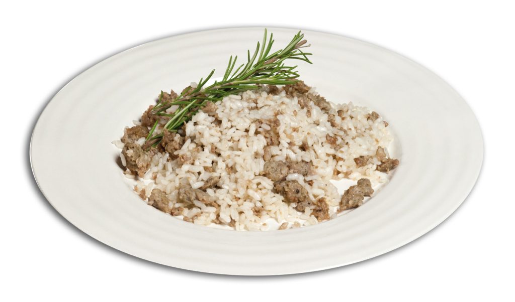 80-100 gr di riso Vialone Nano a testa, una quantità pari di salamelle (o pesto per risotto), burro abbondante e formaggio Grana Padano grattugiato. Il riso va cotto come indicato precedentemente. Il condimento si prepara facendo soffriggere nel burro il pesto; alcuni aggiungono anche vino bianco. La carne deve rimanere morbida. Aggiungere questo condimento al riso e mescolare. Lasciare quindi riposare per 10 minuti circa nella pentola chiusa da un canovaccio e poi col coperchio. Aggiungere il formaggio Grana Padano grattugiato. Esiste anche la versione più ricca, col puntèl (puntello) che prevede l’aggiunta al riso così preparato di una braciola o di un paio di costine di maiale cotte a lungo nel vino bianco.